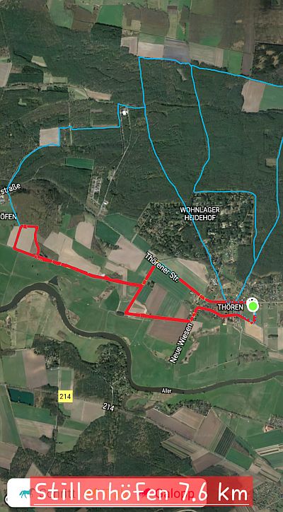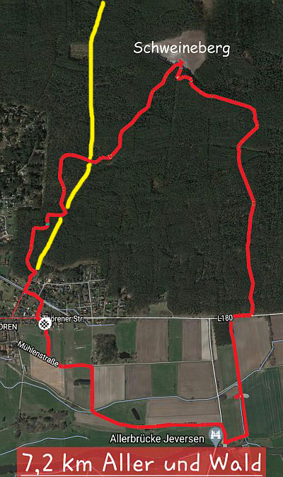 Oben re.: Von Ropemakers Island über "Alt Thören " (Dorfstrasse), über Felder nahe Stillenhöfen und zurück über Radweg L180 (7,5 km). Die sichtbaren Wege im Wald sind für Forstmschinen befahrbar, aber eine Vielzahl der Wege, nicht auf Anhieb auf den Karten erkennbar, sind "einspurige" Waldpfade. Im gesamten Wald existieren keine Schotterwege oder steinige Wegstrecken - abgesehen der gelb markierten Linie. Unten li.: Von Ropemakers Island über Allerdeich, Allerbrücke über L180 in den Zauberwald, nach Norden zum Schweineberg und zurück (7,0 km). |